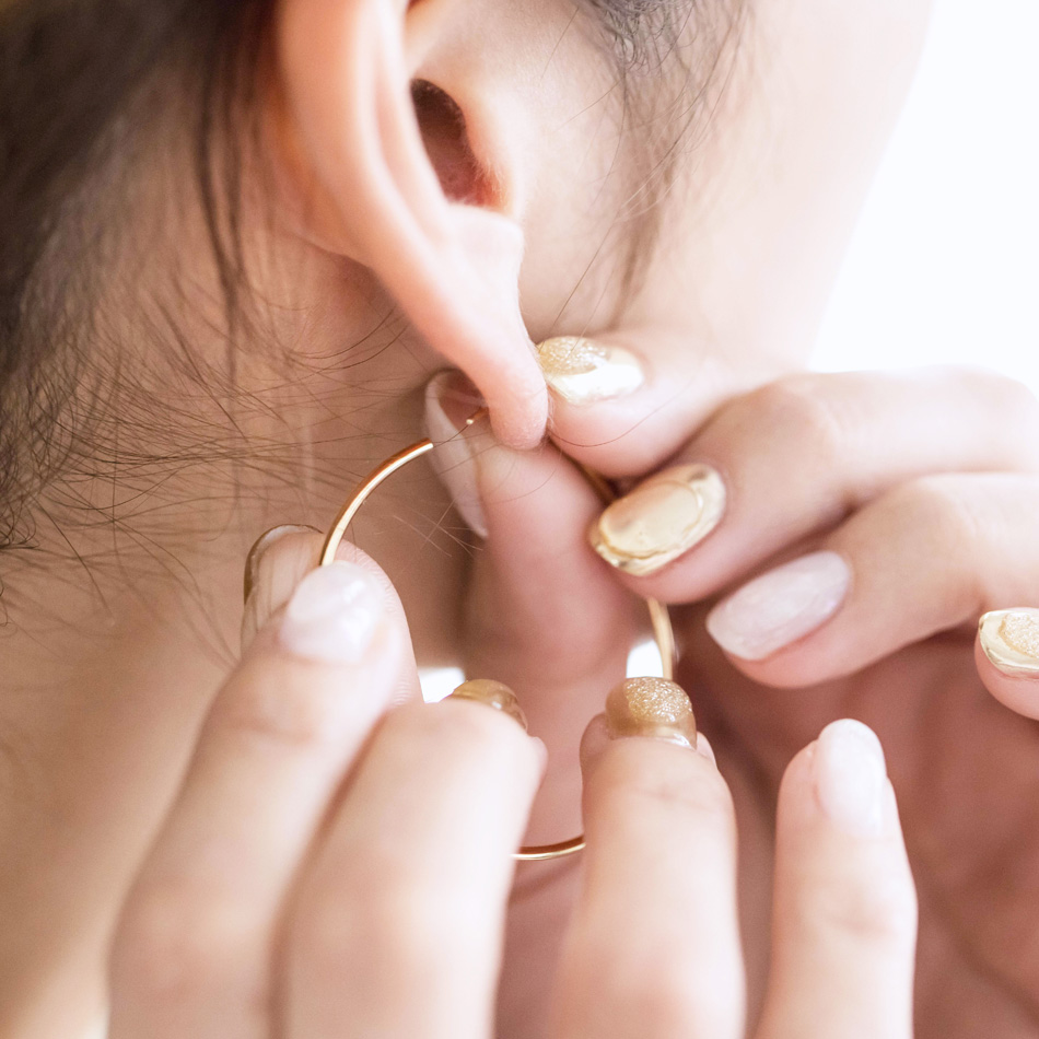 フープピアスは直径(輪のサイズ)が小さいほど落ち着いた印象に、大きくなるほど華やかに見えます。